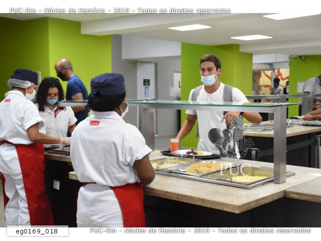 Alunos e funcionários usam máscaras no bandejão da PUC-Rio. |