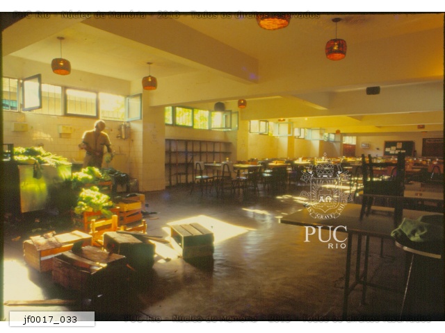 Bandejão da PUC-Rio. Um funcionário limpa verduras. |