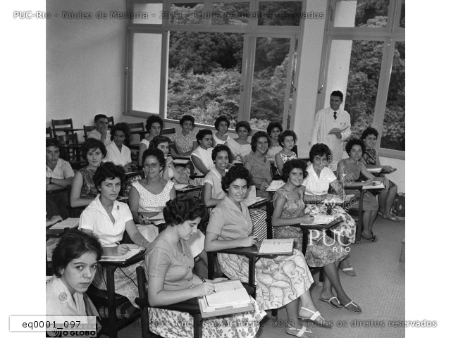 Alunas do Colégio Teresiano tem aula em sala da PUC-Rio. É provável que as instalações do Teresiano ainda estivessem em obras. |