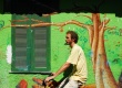 foto artística com pintura na parede de fundo e no centro aluno não identificado sentado sob uma bicicleta. |