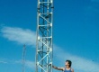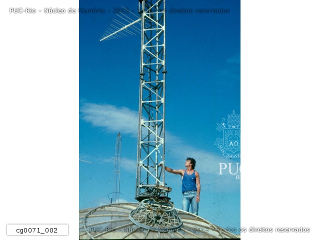 Técnico Walter ao lado de uma torre e antena no terraço da Ala Kennedy. Walter era responsável pela montagem e manutenção das antenas em desenvolvimento para estudo e pesquisa. |
