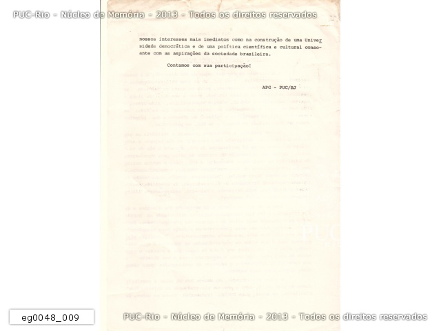 | Série de cartas da APG para a comunidade acadêmica da PUC-Rio sobre a demissão de professores da Pós-Graduação. - eg0048_008 |