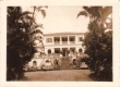 Jardins do Solar, parte da frente. O Solar ainda estava com as varandas fechadas, que criaram novos cômodos. Pessoas na sacada inferior. Dois automóveis estacionados na frente. |