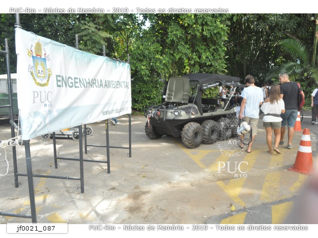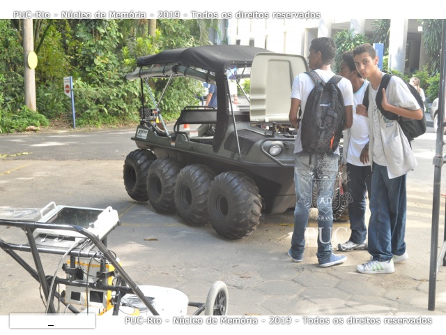 Visitantes no evento PUC por Um Dia, em estacionamento próximo ao bloco A do Ed. Cardeal Leme, junto a carro para deslocamento em terrenos difíceis. |