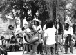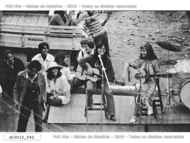 Grupo de alunos em sarau, com duas moças ao violão, em palco improvisado. |