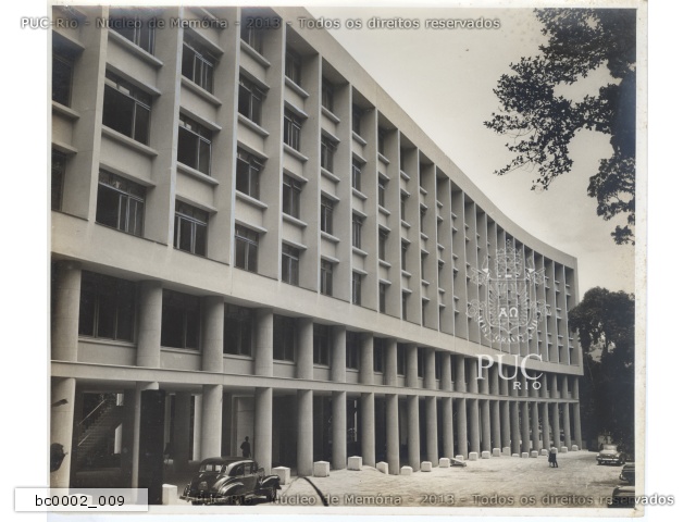 Prédio do Instituto de química em conclusão visto a partir dos pilotis da Ala Kennedy. Casas remanescentes de uma das vilas existentes nos terrenos da PUC-Rio. |
