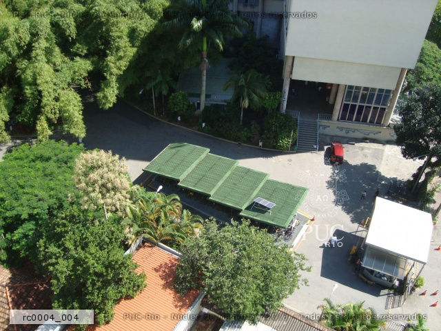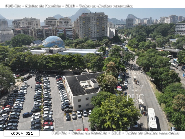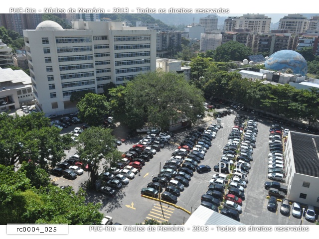 Imagem a partir do alto para o estacionamento principal. Vê-se o edifício do TecGraf, o Instituto Gênesis e o Planetário da Gávea. |