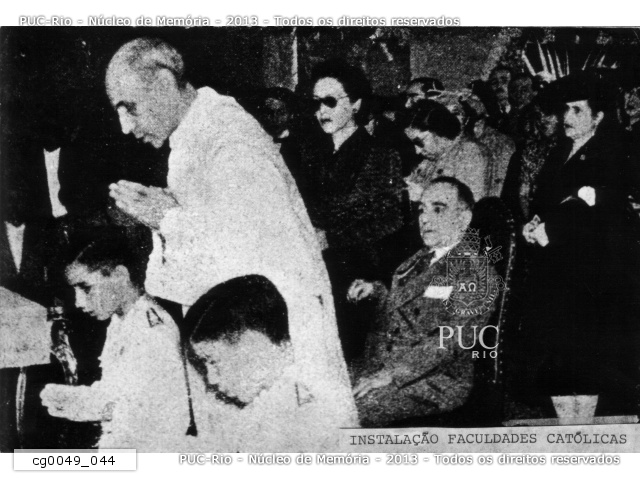 Solenidade da instalação das Faculdades Católicas com a presença do Reitor pe. Leonel Franca S.J. e do então presidente Getúlio Vargas. |