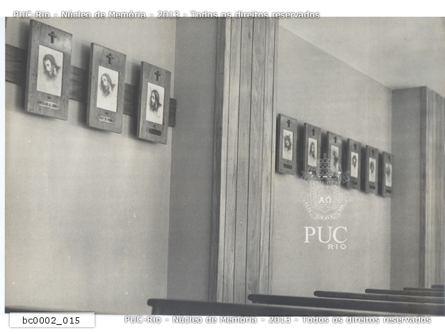 Parede da primeira capela do Campus Gávea, com com via sacra composta por gravuras de Carlos Oswald. |