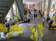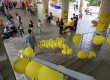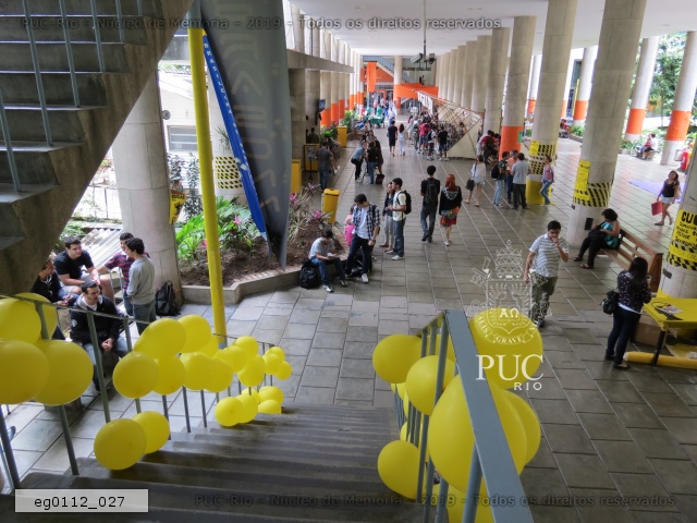 Intervenção com faixas laranja e amarela, e balões amarelos, nas escadas e pilotis do edifício da Amizade, com propaganda de chapas que disputaram as eleições de 2011 para o Diretório Central dos Estudantes da PUC-Rio (DCE). Propaganda do Festival da Primavera. |