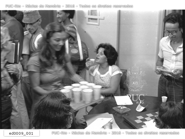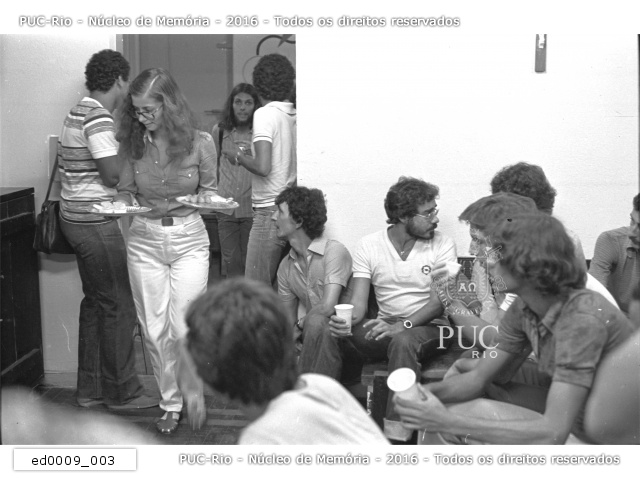 Reunião durante entrega de prêmios na Semana da PUC de 1971. Provavelmente, da equipe ganhadora da gincana e membros da organização da Semana. |