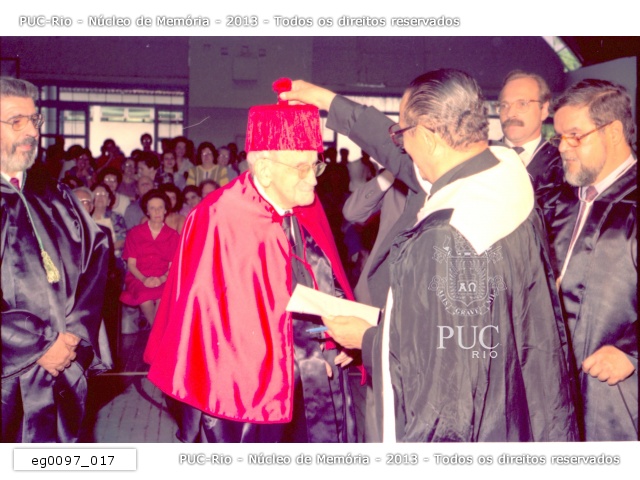 Cerimônia nas comemorações dos 50 anos da PUC-Rio na qual foi concedido o título de Doutor Honoris Causa a Sobral Pinto. |