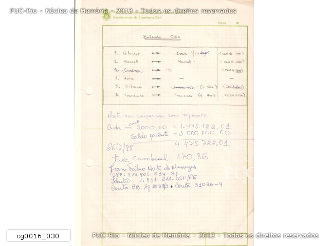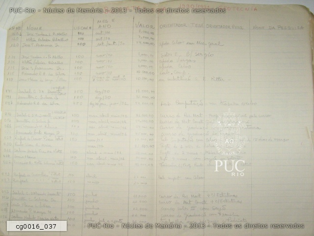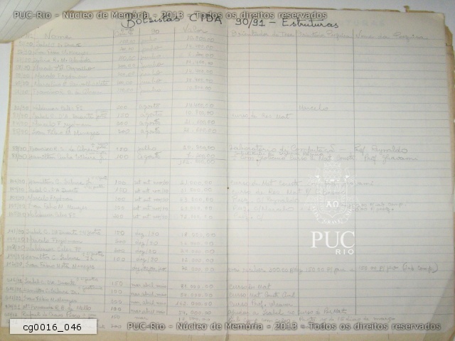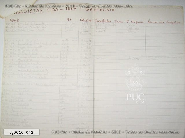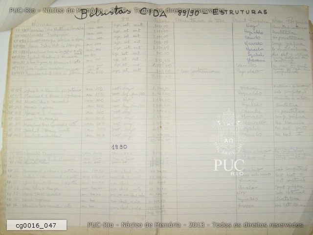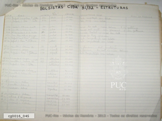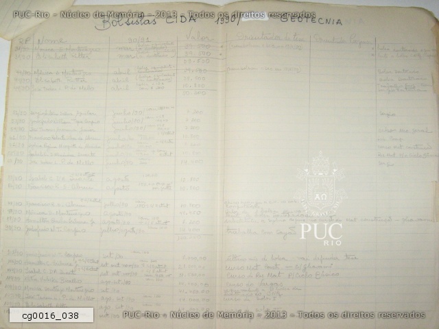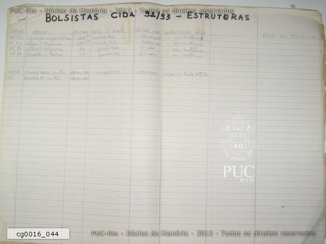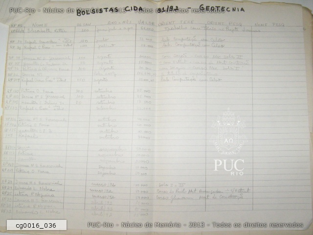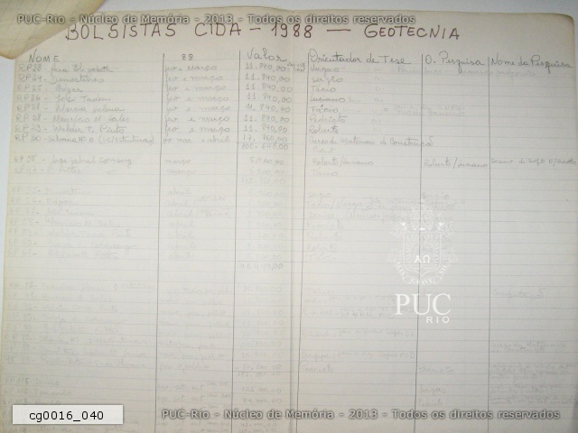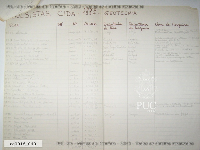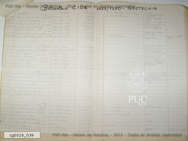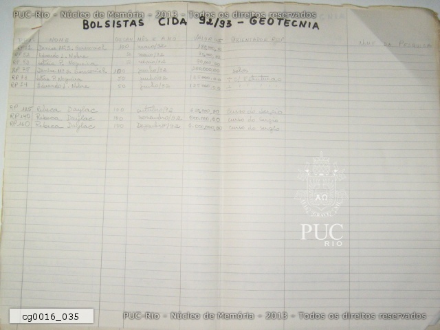 Planilha manual de controle dos bolsistas CIDA 1992/1993 em Geotecnia. |
