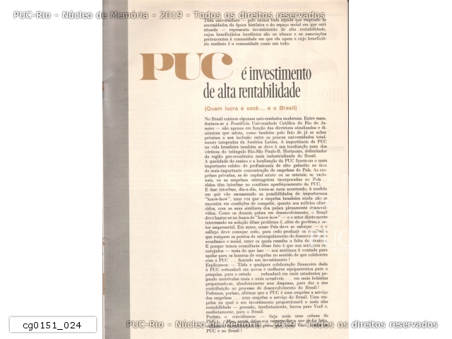 Página do folder de divulgação da Campanha Financeira "Seja mais uma coluna da PUC". Texto com o título "PUC é investimento de alta rentabilidade". A PUC-Rio se destacaria dentre as outras universidades do Brasil por estar "entre as poucas universidades totalmente integradas da América Latina". "A qualidade do ensino e a localização da PUC fazem-na o mais importante celeiro de profissionais de alto gabarito na área da mais importante concentração de empresas do País". |