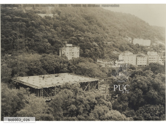 Obras do Edifício da Amizade e, do lado direito, o Parque Proletário da Gávea. Ao fundo, os prédios da rua Marquês de São Vicente. As obras da Ala Kennedy estavam bem encaminhadas e a da Ala Frings, no começo. Note-se o portão de entrada no canto inferior direito. |