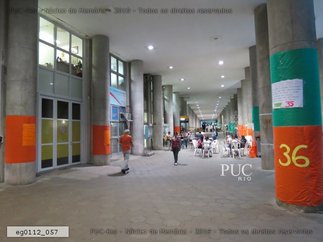 Pilotis do edifício Cardeal Leme decorado com faixas laranja e verde com propagandas de chapas que disputavam as eleições de 2011 para o Diretório Central dos Estudantes da PUC-Rio (DCE). Em frente ao PIUES e à livraria Carga Nobre. |