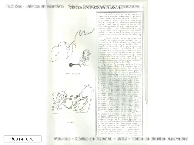 Página 02. Editorial. Charge. Apresentação da Semana de Calouros de 1977. |