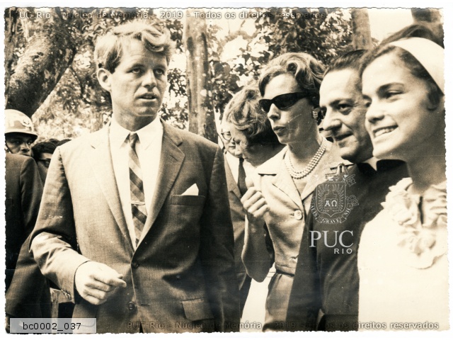 O senador Robert (Bob) Kennedy cercado pelo público presente à inauguração do busto de seu irmão, John Kennedy. |