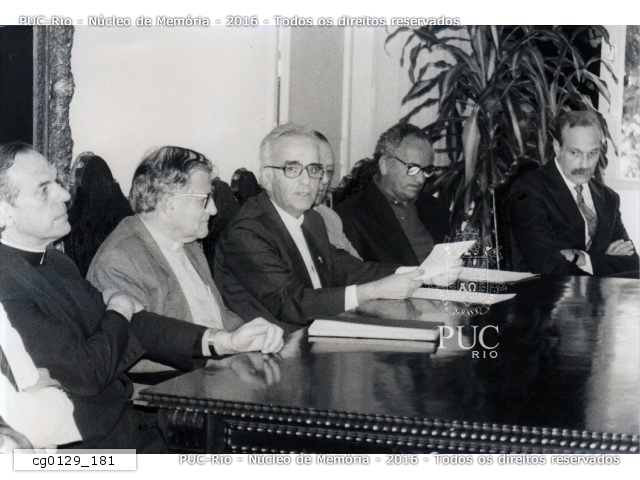 O Reitor da PUC-Rio, pe. Laércio Dias de Moura S.J., assina o documento da posse do professor Nelson Janot como novo Vice-Reitor de Desenvolvimento. A solenidade contou com a presença do presidente da Associação dos Antigos Alunos da PUC, João Sergio Marinho Nunes. |