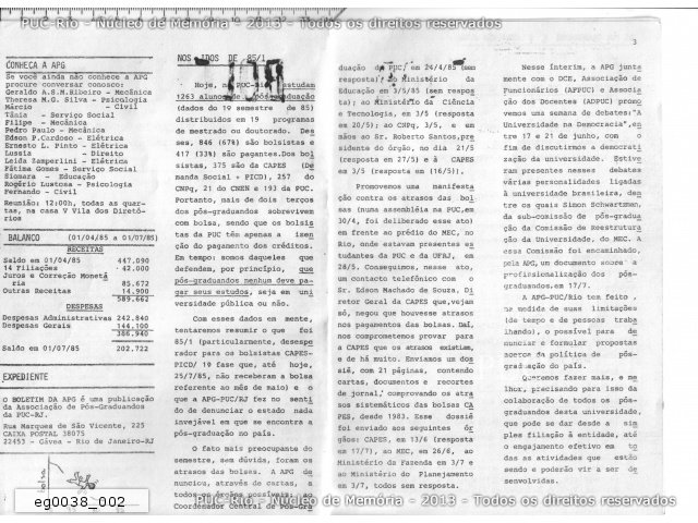 p.2 e 3 - Nos idos de 85/1. Balanço das atividades da APG no semestre. Conheça a APG, que ficava na casa V da Vila dos Diretórios. Dados de alunos e bolsas na pós-graduação da PUC-Rio. |