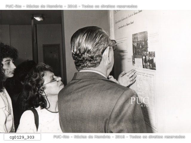 O Reitor Padre Laércio visita a exposição em homenagem aos 50 anos da PUC-Rio, que reuniu documentos textuais e fotografias do Departamento de Serviço Social. |