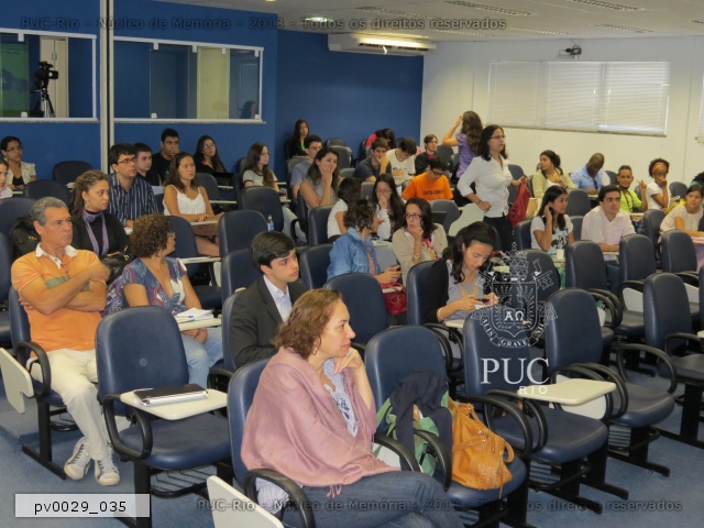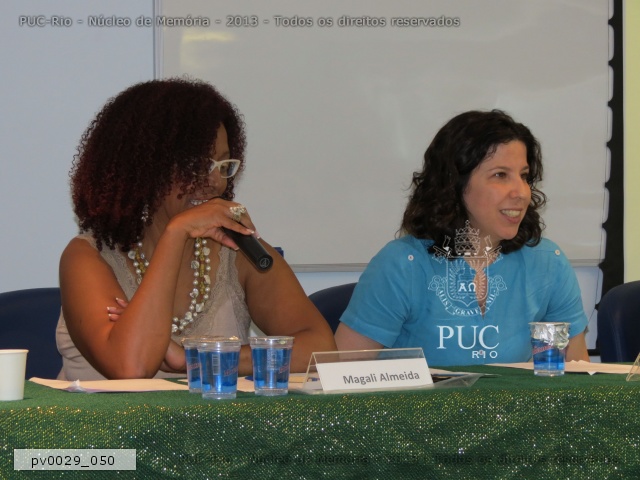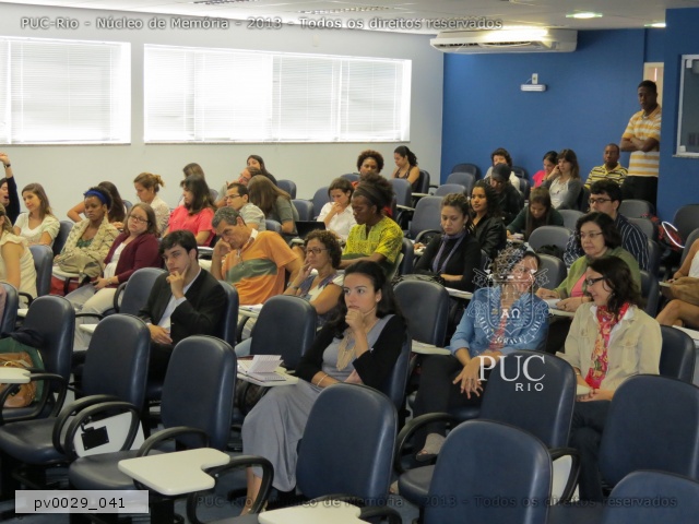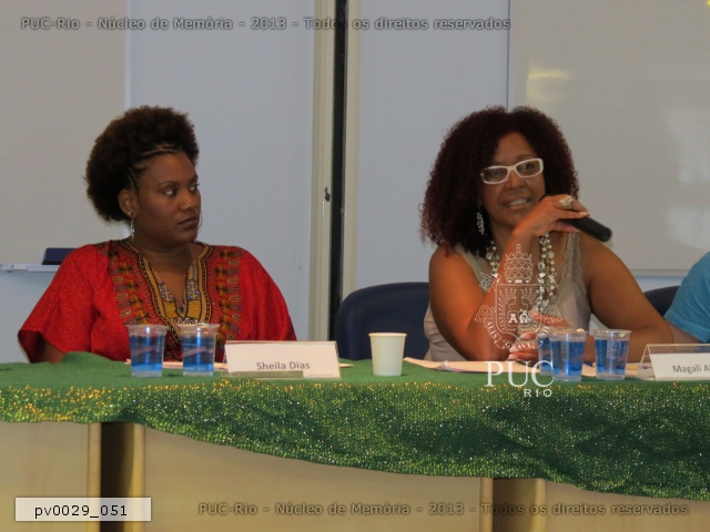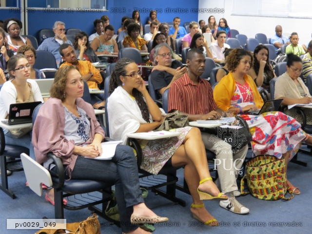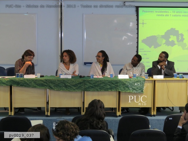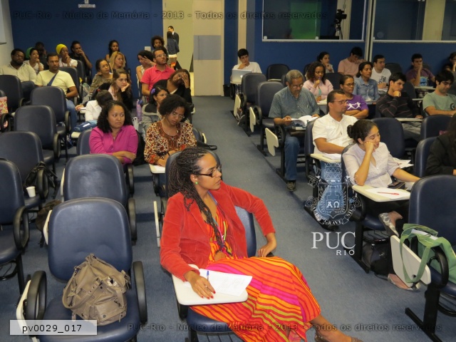 Seminário de Reflexão e Memória da Cultura Afrobrasileira', realizado na PUC-Rio em novembro de 2011. A plateia assiste à mesa 'Gênero, Raça e Sexualidade', coordenada e mediada pela Professora Márcia Nina Bernardes, do Departamento de Direito da PUC-Rio, e formada pelos professores Sonia Giacomini, do Departamento de Sociologia e Política da universidade, Magali Almeida, da UERJ, e Joilson Santana, da SEASDH, e ainda pela representante da Aqualtune, Sheila Dias. |