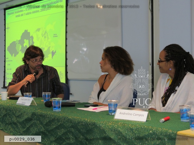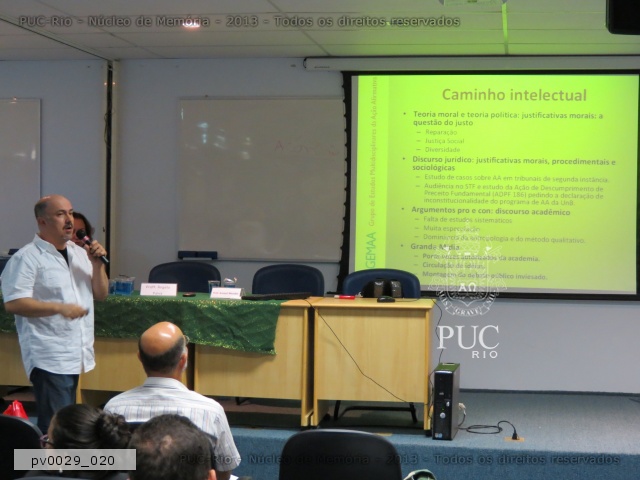 Seminário de Reflexão e Memória da Cultura Afrobrasileira', realizado na PUC-Rio em novembro de 2011. A imagem registra a mesa 'As ações afirmativas e a população negra no Brasil', coordenada e mediada pela Professora Andréia Clapp, do Departamento de Serviço Social, e formada pela Professora Ângela Paiva, do Departamento de Sociologia e Política, e pelos professores Alexandre do Nascimento, Amauri Mendes e João Feres Jr., de outras universidades. No instante, o Professor João Feres Jr. faz sua apresentação. |