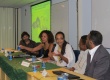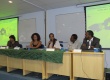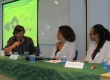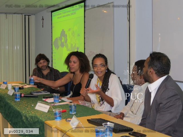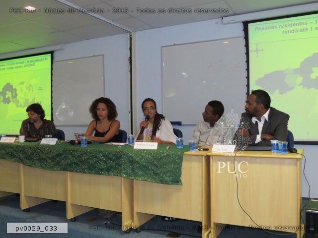 Seminário de Reflexão e Memória da Cultura Afrobrasileira', realizado na PUC-Rio em novembro de 2011. A imagem registra a mesa 'Gênero, Raça e Sexualidade', coordenada e mediada pela Professora Márcia Nina Bernardes, do Departamento de Direito da PUC-Rio, e formada pelos professores Sonia Giacomini, do Departamento de Sociologia e Política da universidade, Magali Almeida, da UERJ, e Joilson Santana, da SEASDH, e ainda pela representante da Aqualtune, Sheila Dias. |