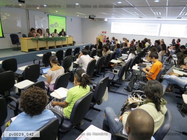 Seminário de Reflexão e Memória da Cultura Afrobrasileira', realizado na PUC-Rio em novembro de 2011. A plateia assiste a mesa 'Territórios e territorialidades negras', coordenada e mediada pela Professora Ynaê Lopes dos Santos e formada pelos professores Maurício Arruti, do Departamento de Educação, Job Eloísio, do Departemento de Direito, e Adrelino Campos. |
