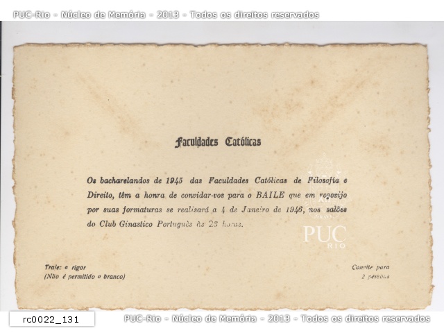 Convite das faculdades católicas de Filosofia e Direito para o baile de formatura de suas turmas de 1945, que foi realizado no Club Ginástico Português. |