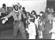 Sorteio de brindes para os filhos dos funcionários. Animador se veste de espantalho. |