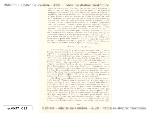 Estrutura da Universidade - Separata da revista Verbum Tomo XXVI Fasc.1, 03.1969. Sobre o momento de mudança (crise) pela qual passava o modelo de universidade no Brasil e no mundo, e a própria ciência. Faz uma breve digressão sobre a evolução da forma de organização e a atuação das universidades e as mudanças pelas quais elas vinham passando nos últimos tempos. |