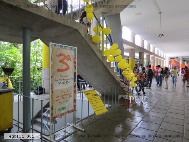 Placa na ala Kennedy com o cartaz da 3ª Semana de Artesanato da PUC-Rio. Ao fundo, faixas e cartazes de divulgação das chapas para os centros acadêmicos e o DCE. |