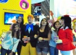 Grupo de jovens com personagens das revistas Bolinha e Luluzinha em frente a um dos estandes. |