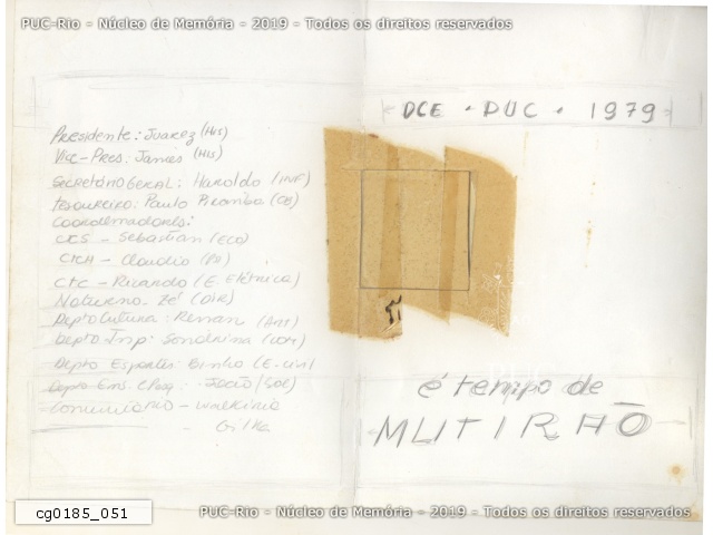 "É tempo de MUTIRÃO". Verso da fotografia cg0185_050 com a lista manuscrita dos integrantes da chapa Mutirão que concorreu e venceu as eleições para o DCE em 1979. |