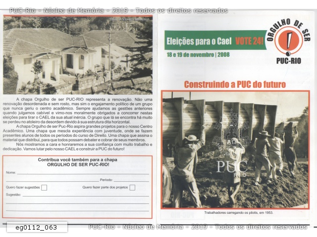 Folheto com o programa da chapa Orgulho de Ser PUC-Rio para as eleições estudantis, centro acadêmico de Direito. O folheto utiliza sem autorização duas fotos do acervo do Núcleo de Memória, uma da Vila dos Diretórios nos anos 1960 e outra de trabalhadores carregando a forma de um piloti em 1953. A mesma chapa publicou uma série de cartazes com fotos antigas da PUC-Rio, todas do acervo do Núcleo de Memória e sem autorização de uso. |
