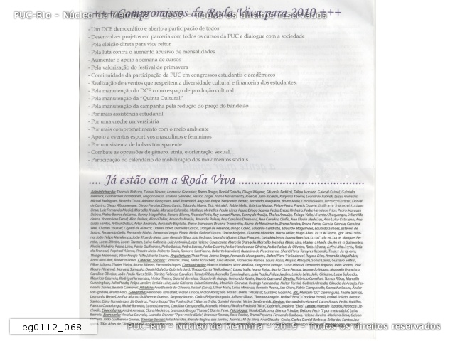 Folheto com o programa da chapa Roda Viva para as eleições estudantis. "Compromissos da Roda Viva para 2010"; "Já estão com a Roda Viva", lista de pessoas por curso que estariam apoiando a chapa, basicamente CCS, algum CTCH e pouco CTC. |