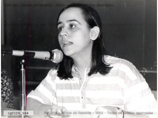 Professora Maria Cláudia Coelho durante o seminário "Jogos, Comunicação e Sociedade". Maria Cláudia foi a organizadora do evento que ocorreu de 7 a 10 de novembro de 1994. |
