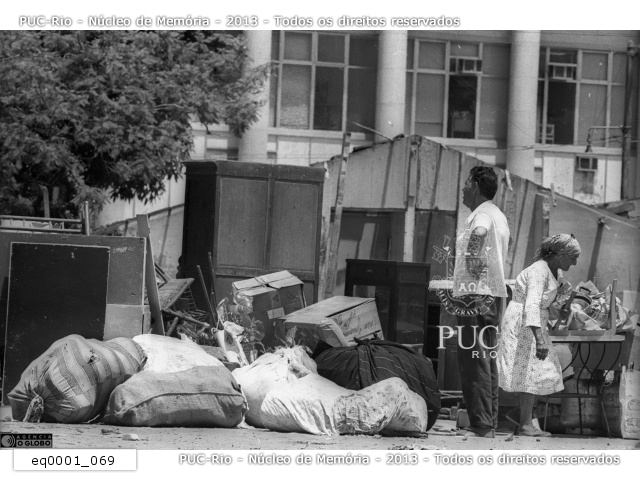 eq0001_069 | 1974 | Moradores com seus móveis no dia da remoção, tendo ao fundo o Edifício da Amizade, ala Frings. |