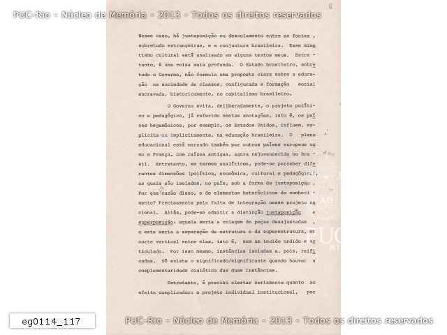 Artigo intitulado 'Anotações sobre o pensamento educacional no Brasil' de autoria do professor Durmeval Trigueiro Mendes, apresentado no seminário dos 20 anos do mestrado em Educação da PUC-Rio. |