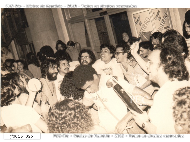 Alunos comemoram o resultado das eleições estudantis. Cartaz chapa Mutirão. Camisetas chapa Unidade. |