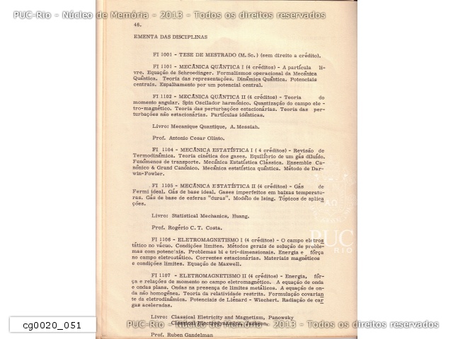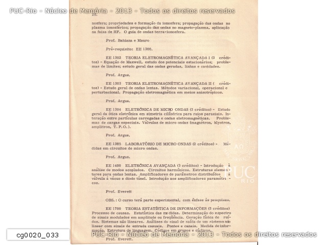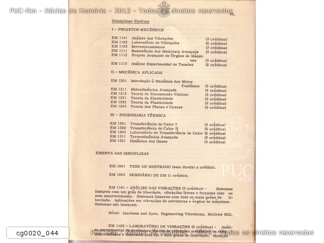 Ementa das disciplinas no Catálogo oficial da Escola Graduada de Ciências e Engenharia (EGCE), 1968 - 1969. |