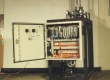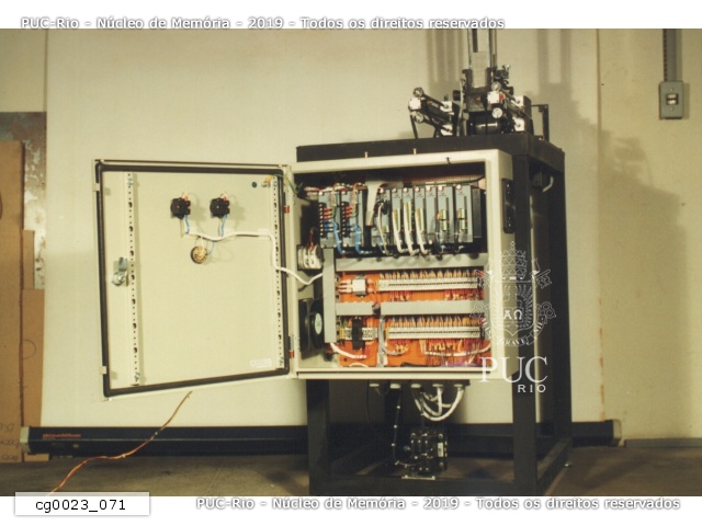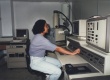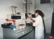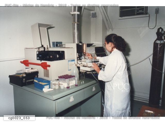Pessoa opera equipamentos em laboratório. Ao fundo, à esquerda, parece ser ou um minicomputador ou um microcomputador do início dos anos 1980. |
