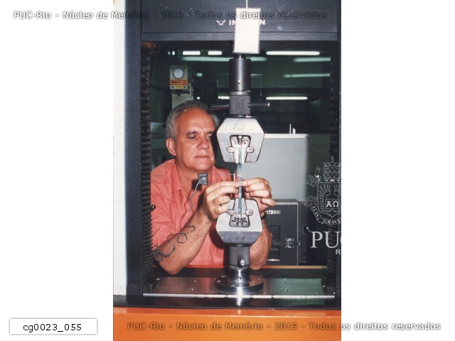 Pessoa opera equipamento em laboratório. Máquina de teste Instron Model 1125 utilizada para a realização de testes de tração. |