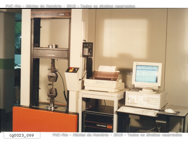 Equipamento em laboratório. Máquina de teste Instron Model 1125 utilizada para a realização de testes de tração. |