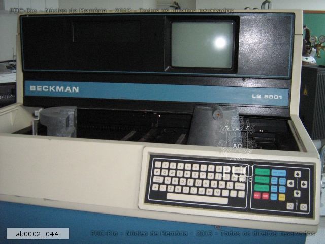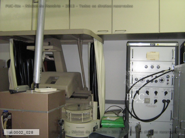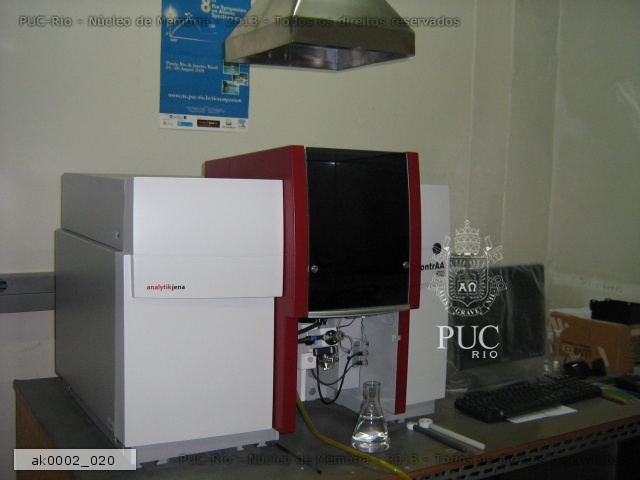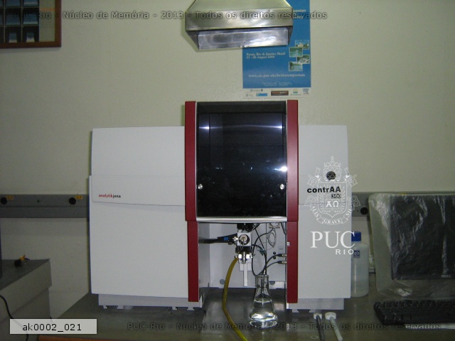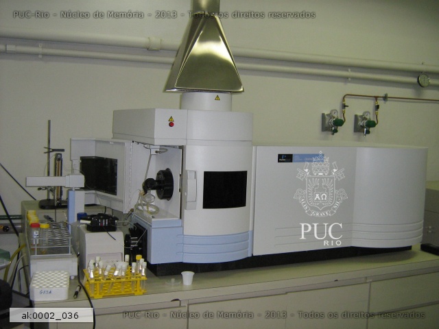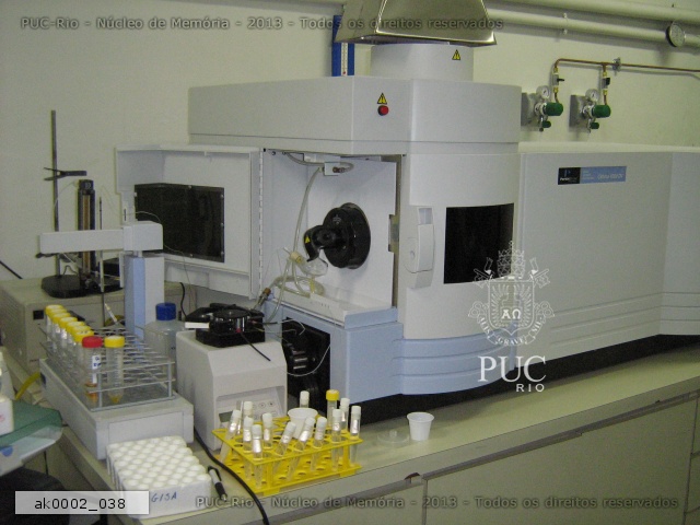 Equipamentos dos laboratórios, tubos de ensaio, carrinho de transporte. Espectrômetro Perkin Elmer - Plasma 1000. |