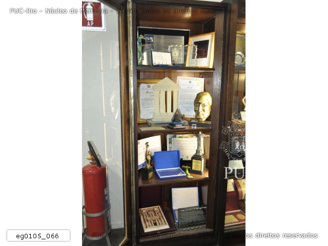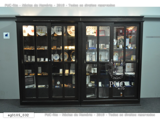 Armário da sala de entrada da reitoria com placas, medalhas, diplomas, pratos brasonados, esculturas e prêmios recebidos de instituições de ensino superior e empresas, memorabílias da PUC-Rio e porta-retratos do pe. Jesús Hortal Sànchez, S.J., com autoridades. |