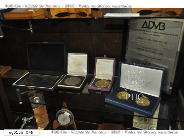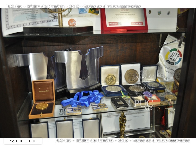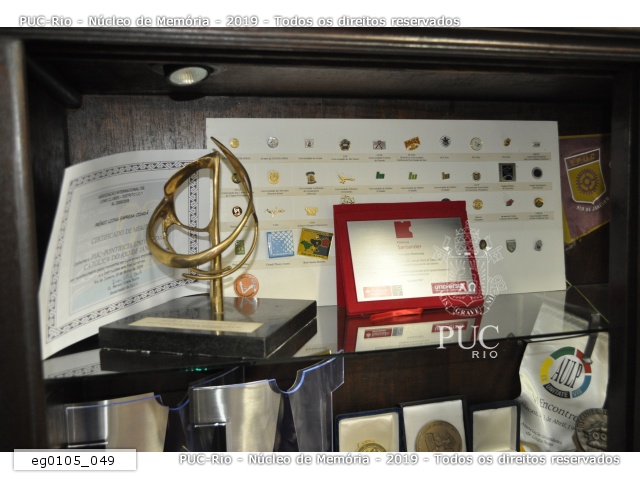 Medalhas, esculturas, diplomas e troféu do armário da sala de entrada da reitoria recebidos de instituições de ensino superior e empresas ou confeccionados pela PUC-Rio. |