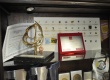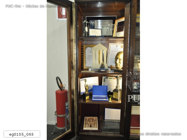 Armário da sala de entrada da reitoria da PUC-Rio com medalhas, placas, esculturas, diplomas, memorabílias e prêmios recebidos de instituições de ensino superior e empresas. |