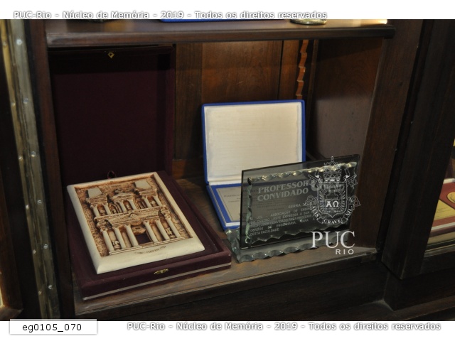 Medalhas, placas e escultura do armário da sala de entrada da reitoria recebidas de instituições de ensino superior e empresas ou confeccionados pela PUC-Rio. |